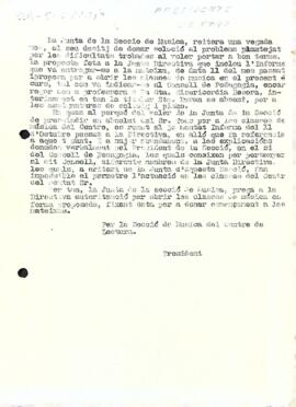 La Secció de Música reitera en la seva carta l'opinió sobre obrir les classes de música i sobre la qüestió del prescindir del professor Tous. Data del document: ?-?-1950
