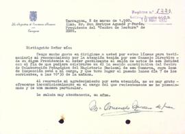 María Consuelo Moreno de Juan, inspectora de Enseñanza Primaria a Tarragona, agraeix al president del Centre de Lectura la cessió de la Sala d'Actes per a celebrar la sessió constitutiva del Centro de Colaboración Pedagógica del Magisterio Nacional a Tarragona. Data del document: 08-03-1960
